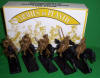 Mounted British cavalry, Mounted German cavalry, Mounted Cossacks. U.S. Infantry, Germans in Pickelhaubes, Germans in Stalhelms, British Infantry, French Infantry, Scots Infantry, Russian Infantry, Indian Army, Indian Cavalry. all foot sets are 20 figures in 10 poses, mounted sets are 5 figures on horse.